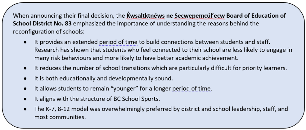 We have begun the process of transitioning Salmon Arm Secondary from a grade 11-12 school to a grade 8-12 school in time for the 2027-28 school year. In essence, we really are creating a new school over the next three years. Part of our collective work involves thoughtfully reflecting on our current practices and systems to ensure our decisions are intentionally aligned with both the needs of students in grades 8 through 12, along with the decision by the Board of Education for school reconfiguration.
